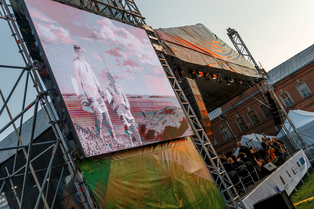 Под руководством маэстро Артема Маркина оркестранты и Владимирский камерный хор, детская хоровая капелла и капелла “Ярославия” исполнили сложное классическое произведение - кантату Сергея Прокофьева “Александр Невский” в семи частях. Солировала Анастасия Хорошева. Видеорядом стали фрагменты классики советского кинематографа - картины Эйзенштейна “Невский”.