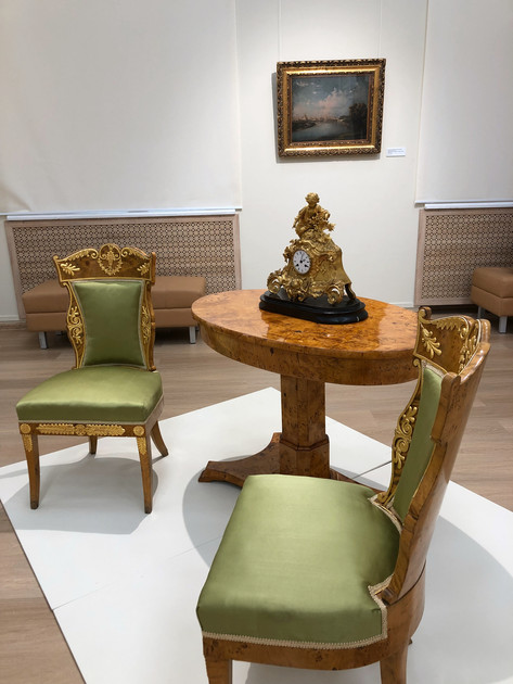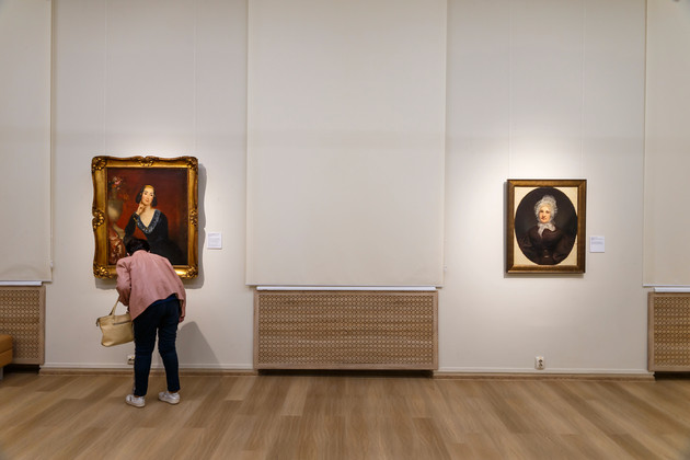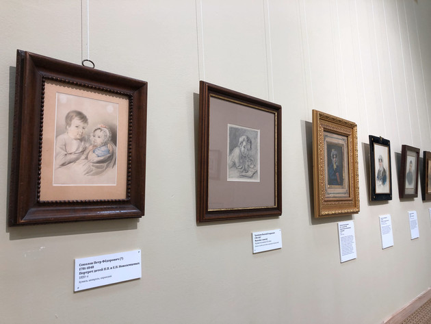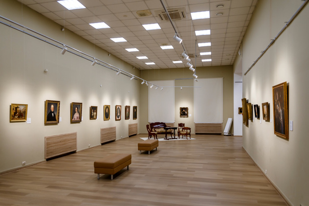 В составе экспозиции - работы «основателя русской акварельной живописи» Петра Соколова (1787–1848), произведения представителя «школы Венецианова», профессора Императорской Академии художеств Сергея Зарянко (1818–1870), единственного в XIX веке профессионального художника чеченского происхождения, академика Императорской Академии художеств Петра Захарова-Чеченца (1816–1846), академика Императорской Академии художеств Карла Рабуса (1800–1857), преподавателя известного пейзажиста Алексея Саврасова(1830–1897). Среди представленных полотен – такие шедевры как портрет Натальи Еропкиной кисти Евгения Плюшара (1809–1880) и портрет прославленной актрисы Екатерины Семёновой в роли Клитемнестры, приписываемый Оресту Кипренскому (1782–1836).
