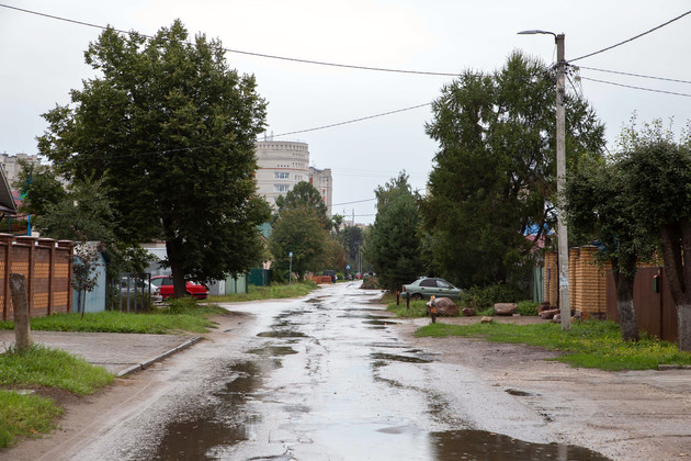 Опасный маршрут. Мы останавливаемся у ФОКа. Тротуара тут нет. Дорога в ямах. Машины маневрируют, огибая их. Сложно предсказать, куда нырнет автомобиль. Дети тоже вынуждены петлять между машинами и между лужами. Такое вот броуновское маневрирование. Это улица Западная. Идем на параллельную Западной улицу Солнечную. Их соединяет Малый проезд. Его засыпали асфальтовой крошкой, но и она не сильно выручает – полно достаточно глубоких ям, грязи.