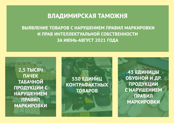 Кстати, всего за три летних месяца Владимирская таможня выявила более 2,5 тысяч пачек табачной продукции с нарушением правил маркировки. Также в ходе проверок обнаружено 43 единицы обувной продукции и товаров легпрома с нарушением маркировки — плюс 550 единиц контрафакта (одежда, обувь и т. п.).