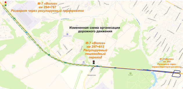Дорожники установят отбойники и перестроят установленный здесь светофор, оставив пешеходную фазу «по требованию». Развернуться можно будет через транспортную развязку на км 300 либо на перекрёстке со светофорным регулированием на 295 км.