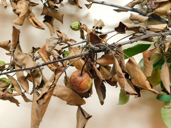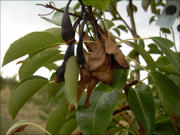 - Заражение побегов. Для этого периода характерно заражение молодых, сочных, вегетирующих побегов в начале лета. Листья чернеют и свертываются, но остаются на ветвях; молодые побеги изгибаются в виде «пастушьего посоха».