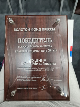 Победителем Всероссийского конкурса «Золотой фонд прессы» и главным редактором года была признана главный редактор «Владимирских ведомостей» Юлия Гущина среди 45 участников конкурса.
