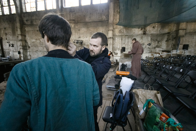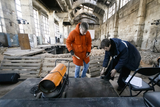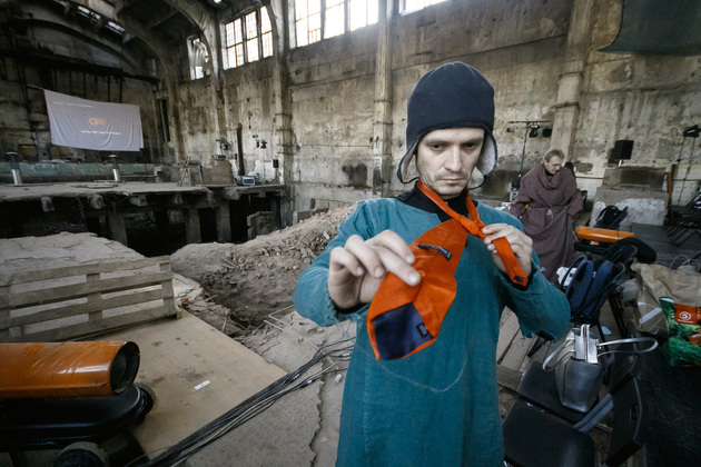 Спрашиваю Антона: «Но как здесь петь? Холод же!». Он уверяет, что, как ни странно, акустика в цехе очень даже естественно-приличная, хотя холод, конечно, мешает и вызывает опасения. Поэтому возле площадки, где располагается хор, все же поставили бесшумные обогреватели, а сами участники запаслись термобельем и согревающими стельками - в обувь, потому что если Аладышев — по ролям — более-менее двигается (на момент репетиции я еще не знала, что актер не просто играет один из эпизодов с голым торсом, но еще и обливается водой), то хор находится в постоянной - стационарной позиции. А стоять на такой температуре больше часа — это чревато для голоса, если, конечно, не подготовиться. «Надеюсь, ресурсов у нас хватит на все премьерные спектакли», - говорит Антон.