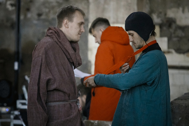 Тем временем в цех буквально влетает Александр Аладышев, пулей мчится к режиссеру, отмахнувшись «потом-потом» от моего «а поговорить» и сразу же занявшись переодеванием в очень колоритные одежки...