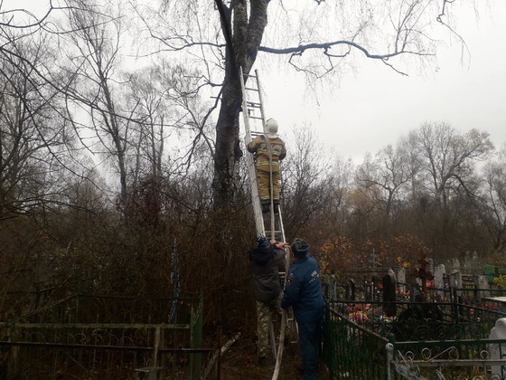 Жительница села Ликино Елена Обрубова несколько дней наблюдала, как симпатичный черный котик сидит почти на самой верхушке старого дерева на кладбище, плачет и не может самостоятельно спуститься. Женщина просила о помощи местных жителей и сотрудников разных ведомств – и наконец-то нашла неравнодушных.