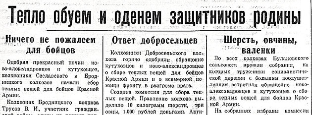 Осенью 1941 года местные СМИ продвигали несколько кампаний в с целью помочь фронту. В городах и селах шел сбор шерсти на валенки, теплых вещей и денег для их покупки в подарок красноармейцам. Два месяца рубрика «Тепло обуем и оденем защитников Родины» рассказывала, кто сколько сдал шерсти, овчин, шапок, свитеров, валенок…