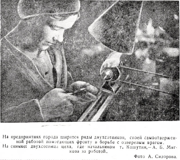 А иные заводы вообще встали! Так было в Гороховце, где, по данным Алексея Арескина, в 1941-м остановились судостроительный и алебастровый заводы. Первый получил военный заказ, но не смог его выполнить. Секретарь партбюро завода на пленуме 26 ноября 1941 года так описывал причину: «Шасси должны получить от главка, но главк дважды эвакуировался из Москвы и сейчас не найдем, где он находится». На многих заводах разворачивалось движение «двухсотников» - рабочих, выполняющих нормы на 200%. Судя по прессе 1941 года, у «двухсотников», в основном, были женские лица.