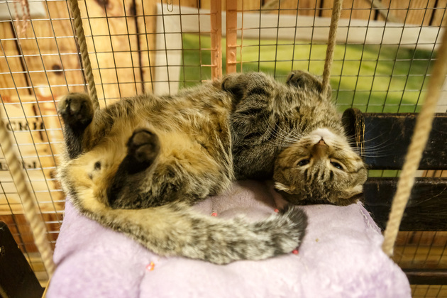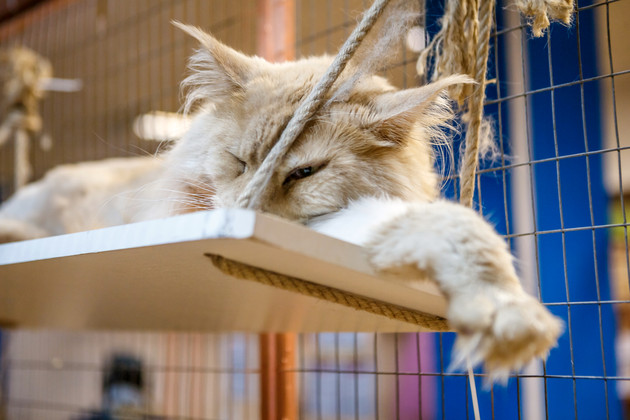 В этот раз мы посетили выставку «Федерация кошек» уже зная, на какие тревожные знаки стоит обращать внимание. Скажем прямо - за 2,5 года лучше кошкам не стало. Как и раньше, большинство питомцев «Федерации» выглядят сонливыми и вялыми. Яркие картинки и плакаты, окружающие вольеры, напоминают посетителям, что длительный сон - это здоровое кошачье состояние. Однако настораживает не сам факт того, что кошки в большинстве своём предпочитают поваляться в лежанках (согласно нормам, кошачий сон длится от 12 до 16 часов), а то, насколько бездвижно кошки лежат. Кажется, что животное даже не дышит. А когда посетители решают погладить пушистого, он реагирует столь заторможено, что возникают сомнения - а действительно ли такой сон идёт кошке на пользу?
