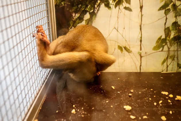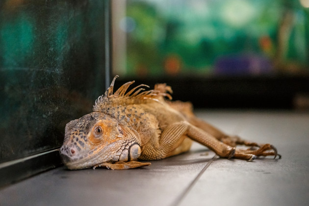 В целом животные Zooland выглядят лучше, чем кошки с выставки, но смотреть на них из-за стекла очень грустно. Некоторые обезьянки, например, сворачивались клубком в уголке и даже не показывали свои мордочки. Наверняка на воле они бы себя так не вели. Несчастную черепаху, кстати, мы тоже нашли. Её в вольере не держат - животное может передвигаться по всей территории выставки свободно. Но большую часть времени оно проводило возле миски с огурцами. Каких-то повреждений или ран у черепахи мы не обнаружили, однако настораживает, что животное в принципе ничем не ограничено. Рядом с черепахой обнаружилась такая же свободолюбивая игуана. Случайно наступить на животное легко - достаточно просто не смотреть под ноги. Видимо, в таком передвижном зоопарке есть только два варианта содержания - либо небольшой вольер, либо вообще абсолютно без него.