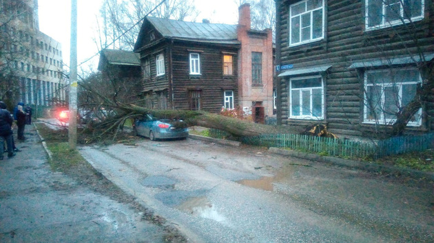 30 ноября штормовой ветер с корнем вырвал дерево на улице Хирурга Орлова в областном центре, которое разрушило деревянный забор у дома и придавило припаркованный автомобиль. Фото иномарки выложено в одном из городских пабликов.