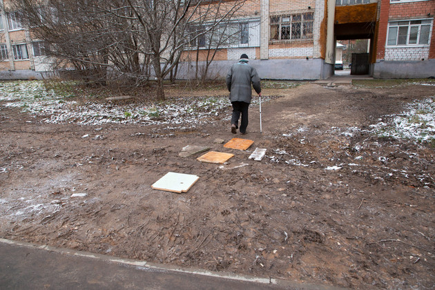 Негативные последствия строительства обнаружились и на улице Василисина. «Теперь мы не можем заходить в наш двор через арку, людям пришлось сделать дорожку из фанеры», - показывает Наталья на импровизированную переправу рядом с домом №8 через грязевое болото – иначе эту жижу просто не назовёшь. Раньше тут были газон и тропинка во дворы, теперь дорожники разрыли её до состояния полного отсутствия прохода. На наших глазах пенсионер с тросточкой попытался принять участие в этом «Форт Боярде» по-владимирски. Мужчина с трудом перебрался на другую сторону.