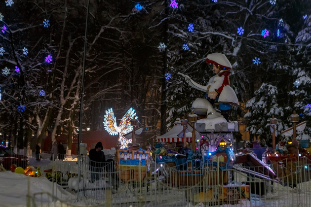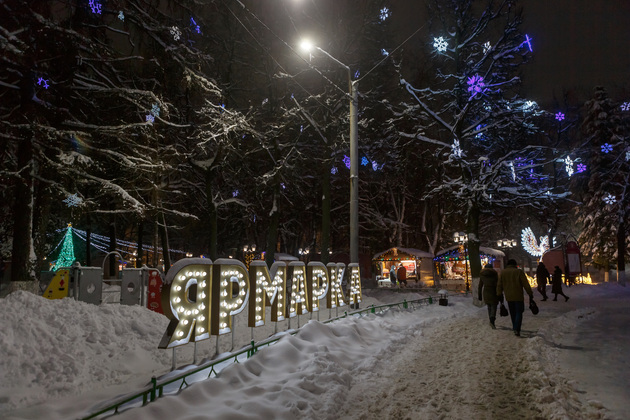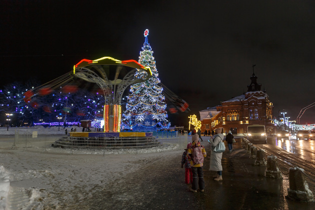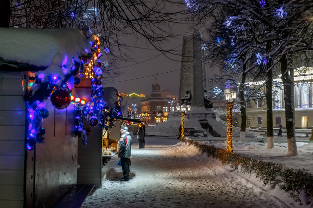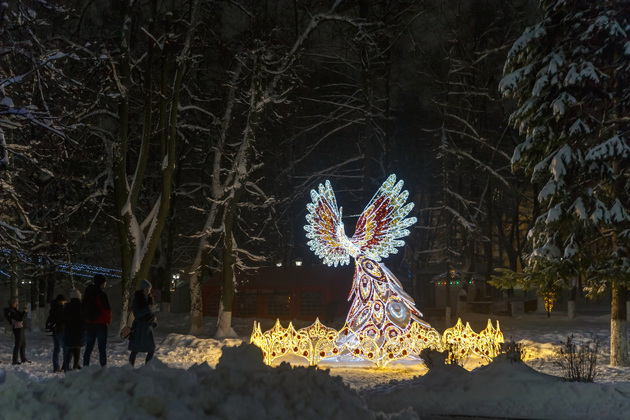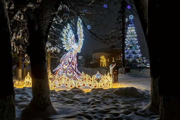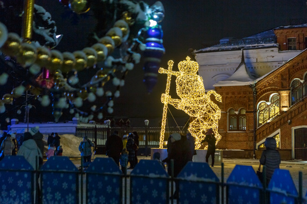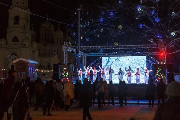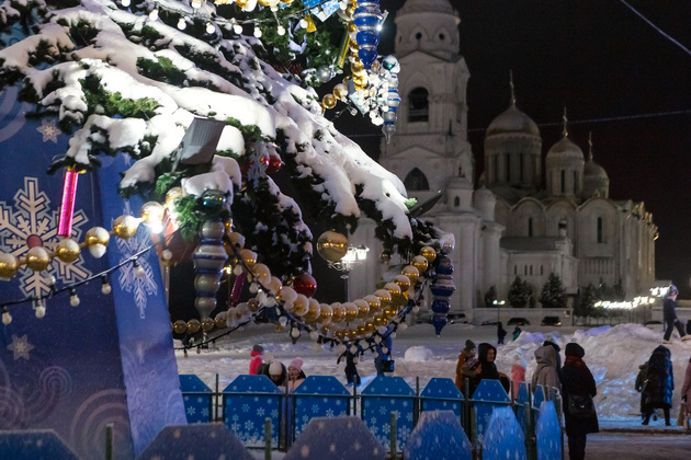 Светящийся золотой владимирский лев, жар-птица и главный символ Нового года - елка. На Соборной площади торжественно открыли рождественскую ярмарку, на сцене выступили ведущие коллективы, закружили карусели. Сувенирную продукцию местных производителей можно купить в домиках-шале.