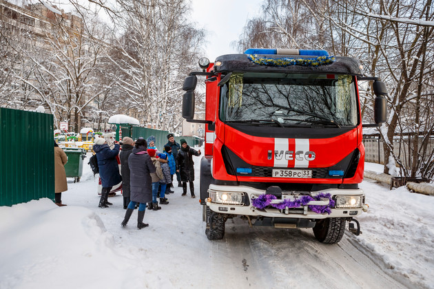 Морозным утром новенькая пожарная автоцистерна, недавно поступившая на вооружение в пожарную часть №2, привезла к воротам детского дома праздничный новогодний «экипаж» - Деда Мороза и Снегурочку. Ребята под наблюдением педагогов высыпали на улицу их встречать.