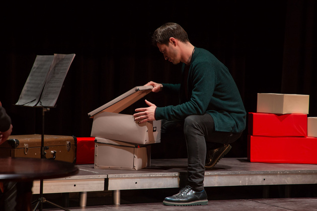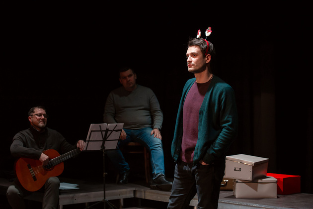 Кстати, начинается все неожиданно. Вот вы расселись по местам, ждете начала, переговариваетесь с соседями... Нет никакого занавеса и гаснущего света. И вдруг «начало» в лице главного актера и артистов хора во главе с его руководителем Антоном Пахомовым заходит на сцену прямо из-за ваших спин — с коробками, гитарой и шумными диалогами. Интерьер — квартира, с елкой, кое-какой мебелью и уставленная все теми же коробками, откуда Саша с ребятами по ходу действия будут доставать всевозможные интересности — от шубы Деда Мороза и коробок от петард до елочных гирлянд и сладостей для зрителей. (Да-да, нас там еще и конфетами старых-добрых советских брендов угощали, свою я с удовольствием слопала. - М.К.).