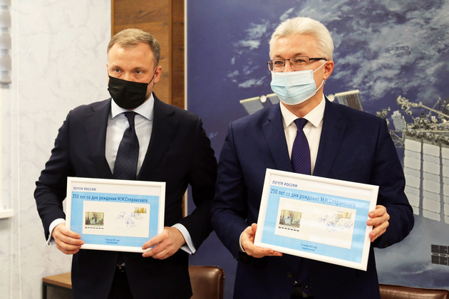 Юбилейные марки и конверты. В тот же день во Владимире, в филиале РАНХиГС состоялась торжественная церемония гашения штемпелем «Первого дня» почтовых марок и конвертов с изображением Михаила Сперанского, выпущенных к 250-летию со дня его рождения.