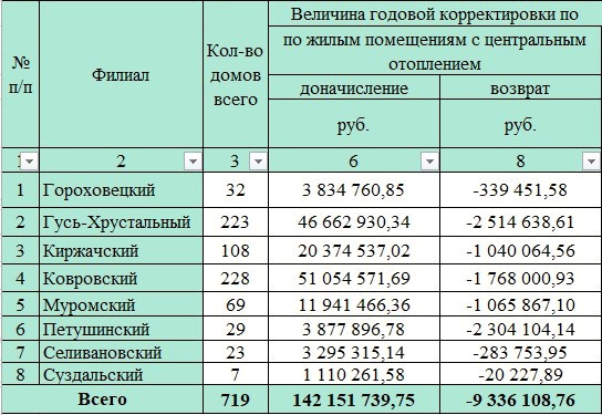 В 2022-м году корректировка будет проведена для потребителей, проживающих в 719 многоквартирных домах, находящихся на территориях присутствия организации. По 69 домам планируется возврат денежных средств, по 650 домам - доначисление. Возврат – 9,4 млн., доначисление – 143,3 млн. Корректировка по территориям присутствия ООО «Владимиртеплогаз» (по жилым помещениям с центральным отоплением):