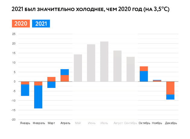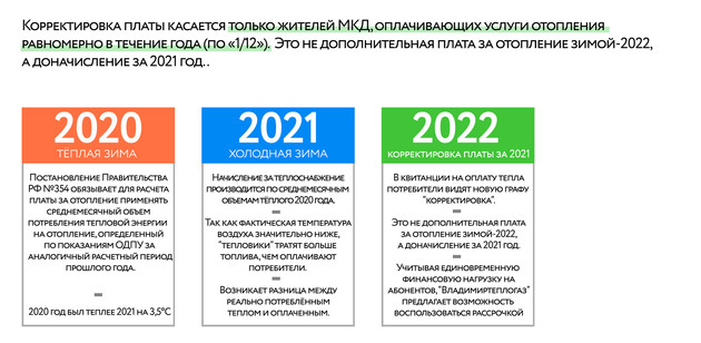 Корректировка в сторону доначисления платы обусловлена фактической температурой наружного воздуха. Во Владимирской области в 2020 году было теплее, чем в 2021, в среднем на 3,5 градуса. Этот среднемесячный объём применялся при расчётах к платежам в холодном 2021-м. Из-за этого возникла разница между реально потреблённым теплом и оплаченным.