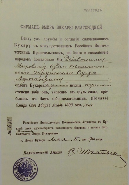 Прокуратура Владимирской области» опубликован удивительный документ: перевод фирмана (указа) эмира Бухары Сед Абдула Ахада от 1900 года о награждении владимирского юриста Ипполита Лупандина, работавшего тогда добавочным мировым судьей Ташкентского окружного суда, орденом Бухарской золотой звезды III степени.