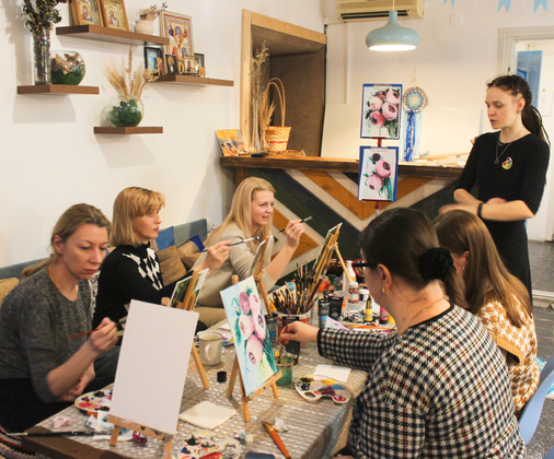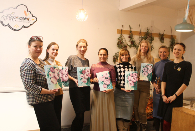 Практические занятия по арт-терапии в уютном кафе провели также специалист по комплексной реабилитации Мария Стеблева и представители НКО «Здоровое поколение». Под руководством художника Жанны Виноградовой мамы рисовали нежные пионы - символ наступающей весны.