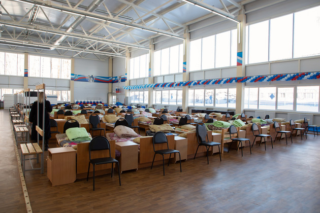 Внутри перемены заметнее. В главном спортивном зале вместо борцовских ковров размещены 55 кроватей с необходимой мебелью при них и комплектами постельного белья. Как объяснил глава администрации Петушинского района Александр Курбатов, эти кровати в спортзале - резервные места.