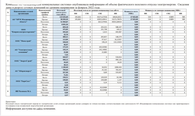Компания АО «Владимирские коммунальные системы» опубликовала информацию об объеме фактического полезного отпуска электроэнергии. Сведения даны в разрезе сетевых компаний по уровням напряжения за февраль 2022 года.