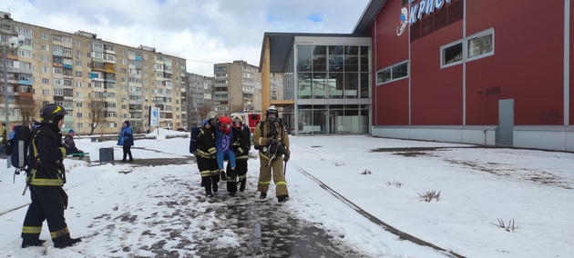 Пожарные тренировались тушить условное возгорание в здании крытого тренировочного катка с искусственным льдом в Муроме. По легенде огонь возник на втором этаже в зале хореографии, нуждались в помощи 3 человека.