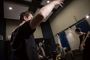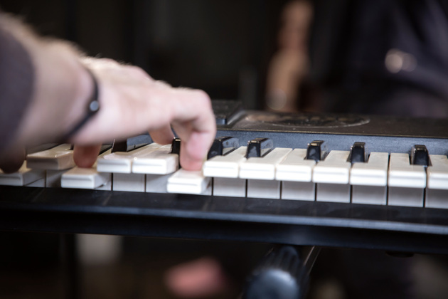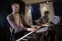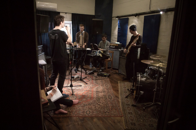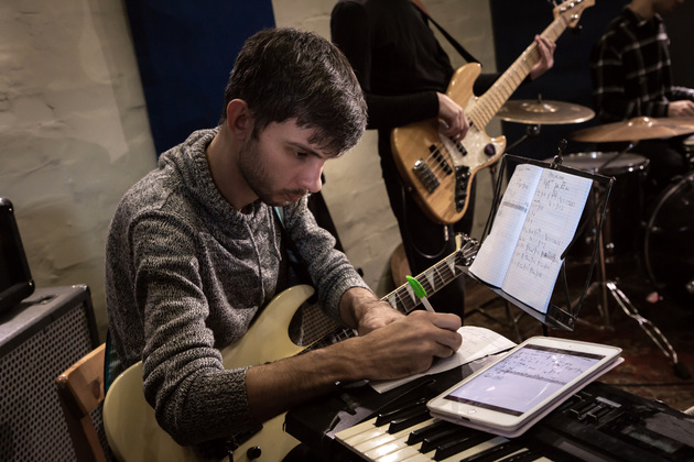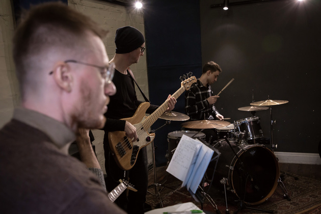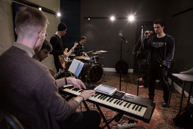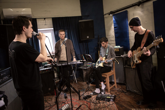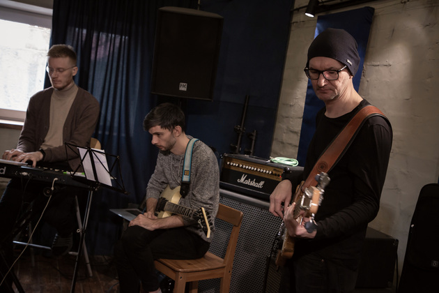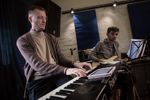 В студии деревянные полы, причем не ламинат настоящие доски с ковром. В одном углу ударная установка. Напротив клавишные, на них уже поигрывает один из музыкантов. Алексей Ярыгин, как нам представил его Александр. Рядом еще один Алексей Соловьев. С гитарой. Почти в центре - микрофон на стойке. Ждем еще двоих басиста и ударника. Пока ждем общаемся.
