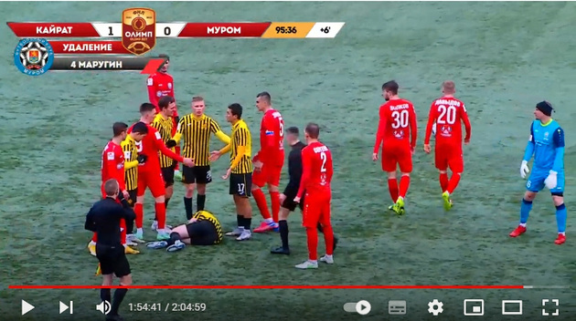 Напряженная концовка порой грозила порой разборками между игроками. Например, футболист «Кайрата» исподтишка ткнул локтем в бок Маругина, а тот в сердцах ударил соперника головой. Последовало долгое лежание кайратовца на поле и - прямая красная карточка Маругину. Удаление! А тут уже подоспел финальный свисток.