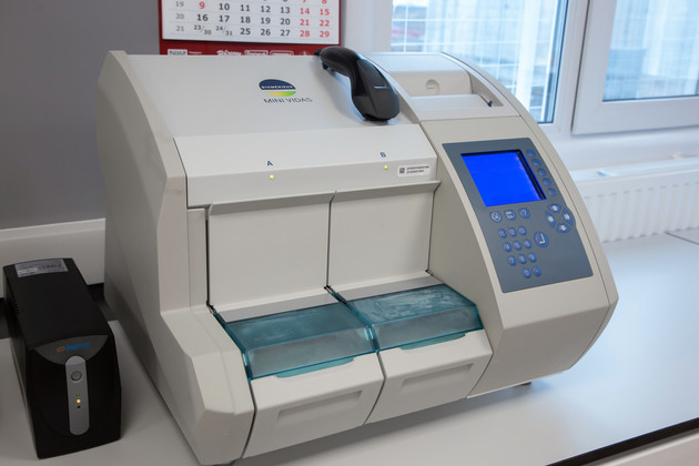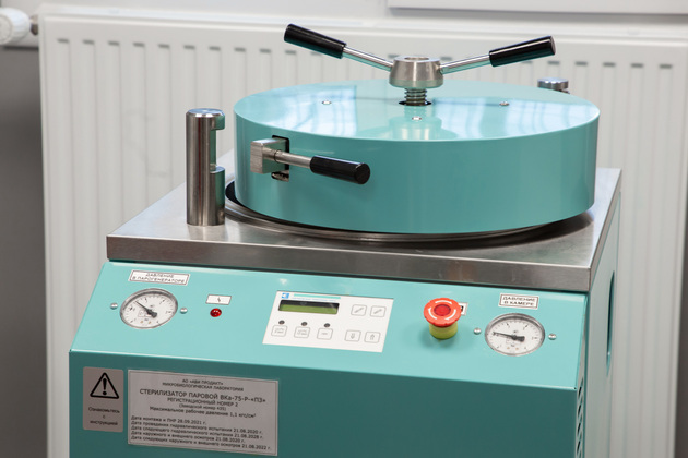 «Моечная» встречает специфичным запахом, ведь в этой комнате обрабатывают свежепоступившую или использованную посуду. Сначала – мойка и ополаскивание дистиллированной водой, второй шаг – стерилизация в автоклаве или сухожаровом шкафе. Посуду передают только через передаточные окна. Все измерительные приборы перед работой проходят процедуру поверки в ЦСМ Владимирской области. Оборудование в основной массе отечественного производства. Самое дорогостоящее в установлено в «заразной» зоне.
