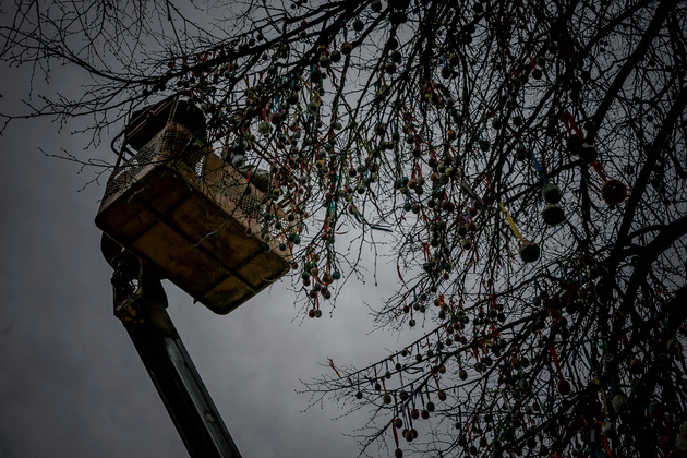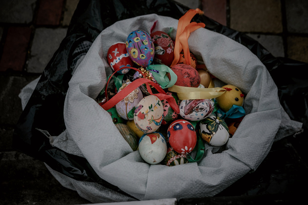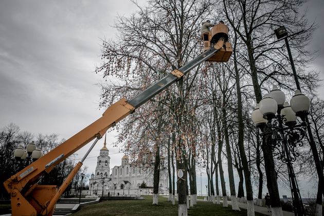 Накануне главного церковного праздника для всех православных в центре Владимира появился арт-объект - липа, украшенная тысячами раскрашенных пасхальных яиц. Декоративные символы Пасхи мастерили дошколята, ученики школ, владимирские предприятия. Все их на дерево разместили с помощью автовышки.