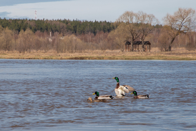 А мы тем временем любуемся разливом — вид на всю пойму великолепный! Вода - почти до горизонта. Плавают дикие утки, у них, кстати, сейчас активное время ухаживаний. Кстати, птицы даже не все улетают на зиму, особенно держатся у моста, где вода не всегда промерзает.