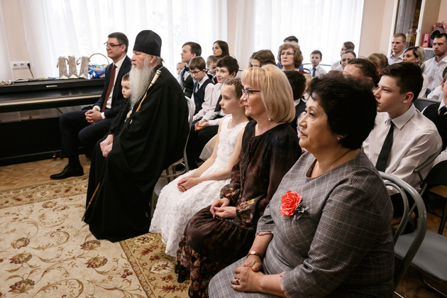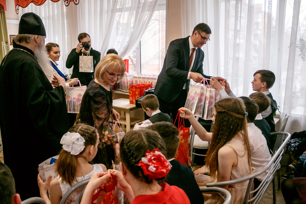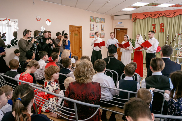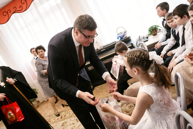 Дети с помощью педагогов подготовили трогательный пасхальный концерт. Когда, совершив экскурсию по учреждению, врио губернатора и владыка митрополит вошли в актовый зал, он был полон детей и их наставников. Почетных гостей тут же усадили в первый ряд.