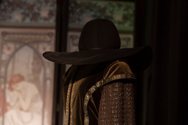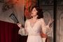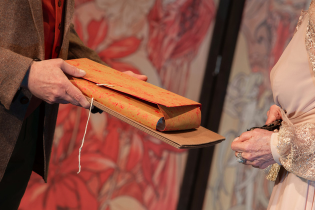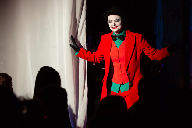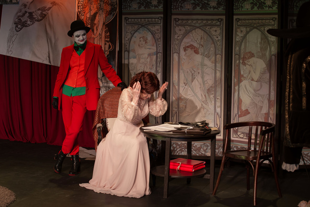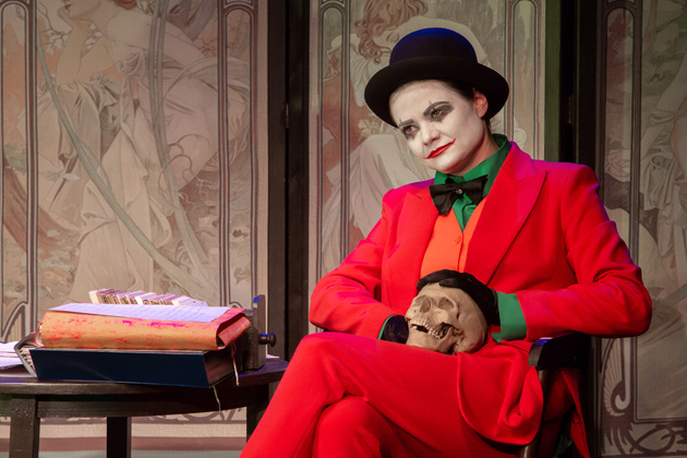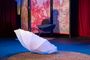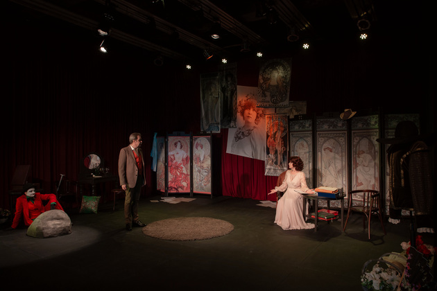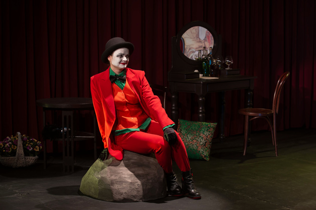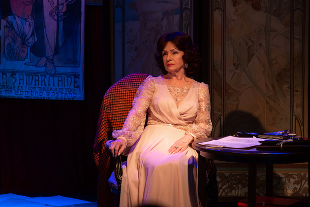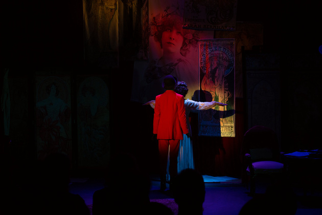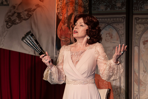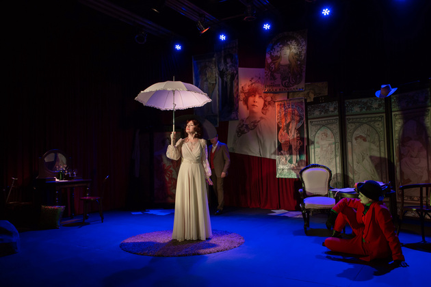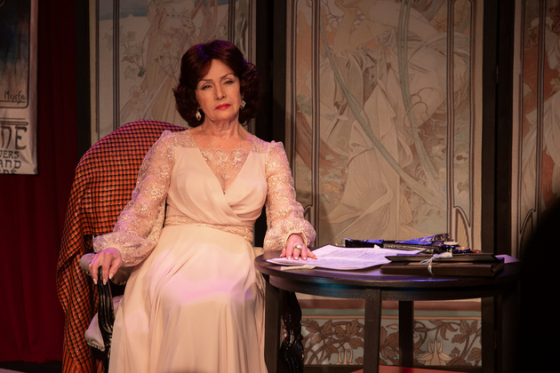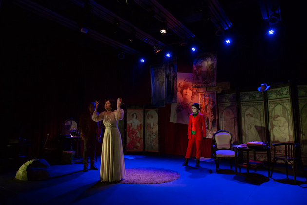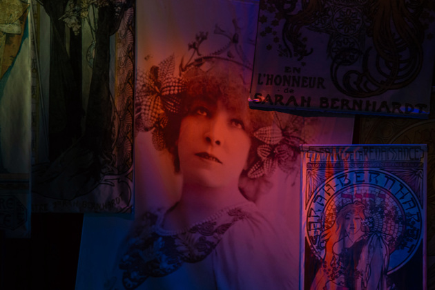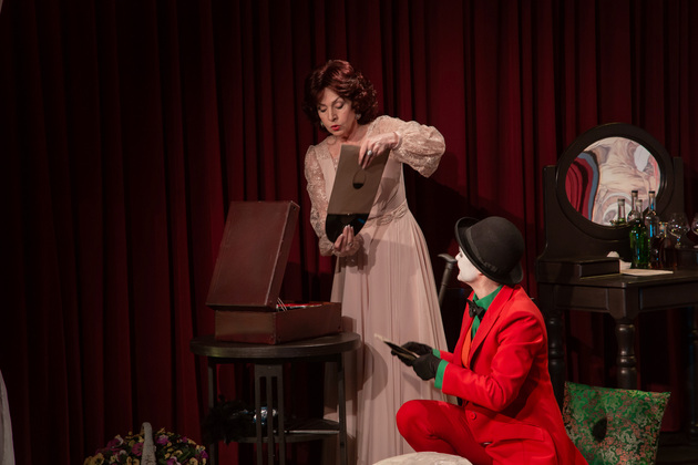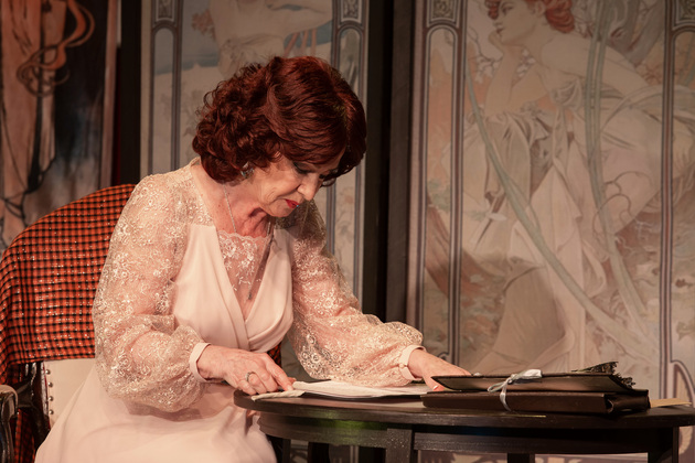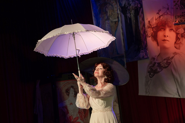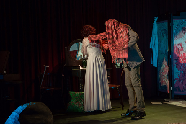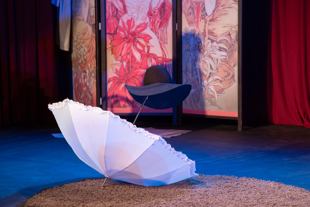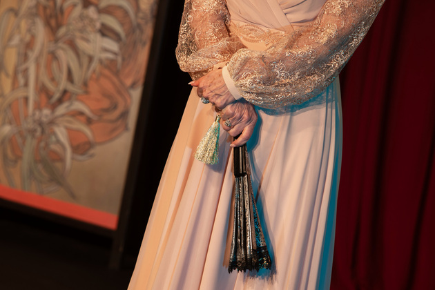 На сцене мы видим изящный декор — и афиши, больше похожие на затейливые карты ТАРО. А еще — актрису (без ноги!) «при параде», с прической, макияжем, в воздушно-шелковом наряде с пайетками. Такие женщины даже в 100 лет на смертном одре не оказываются без маникюра и в пижамке... Может, они и правы.