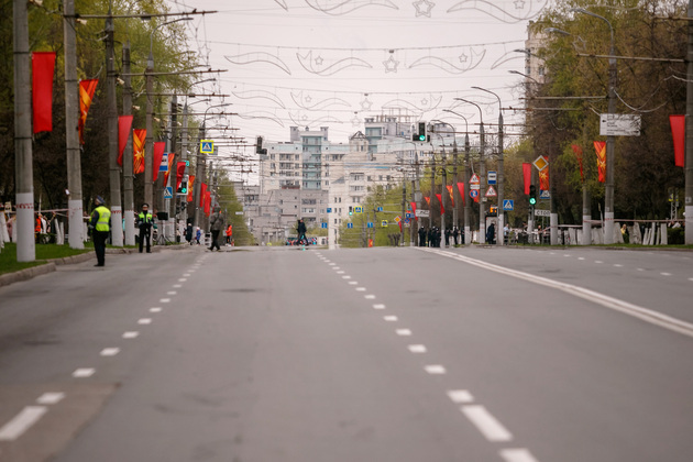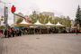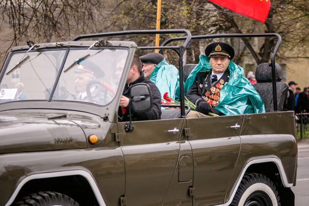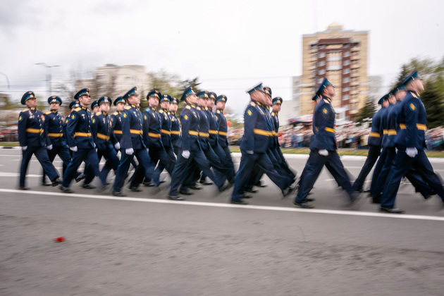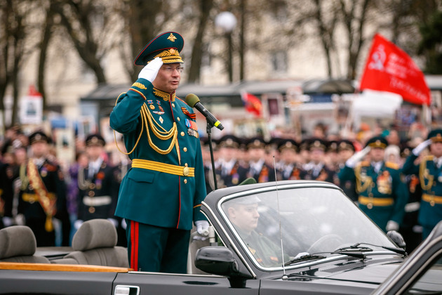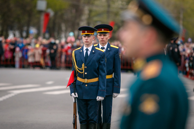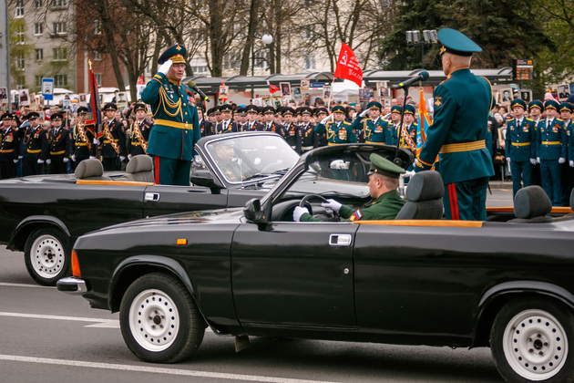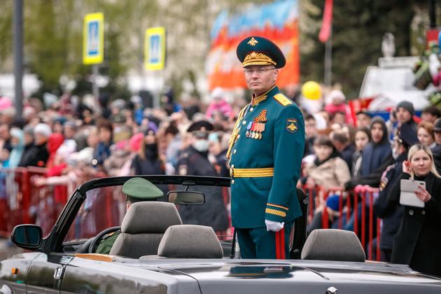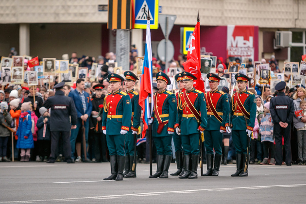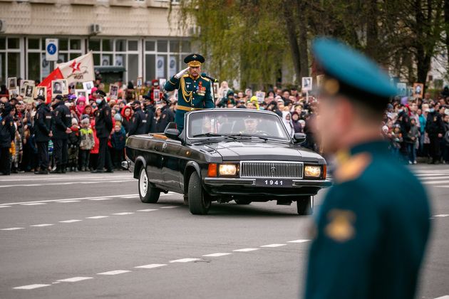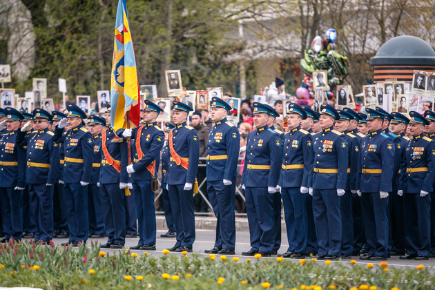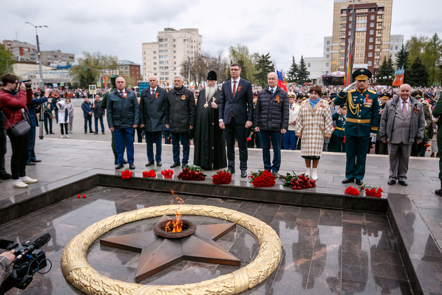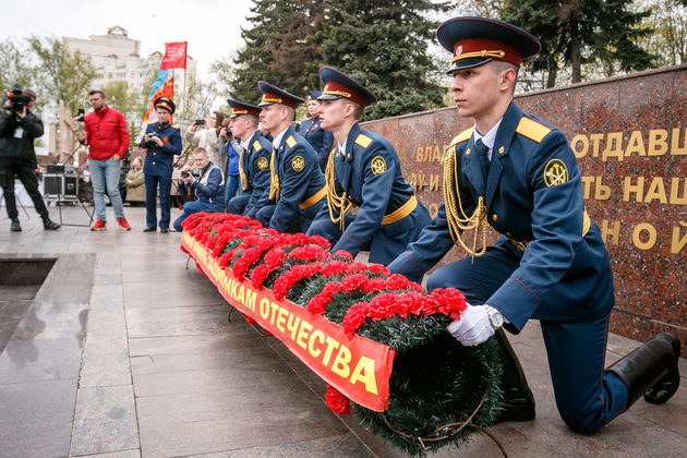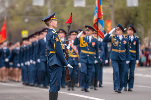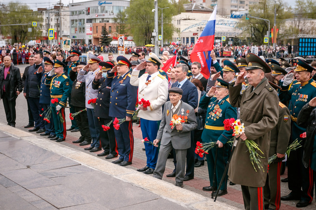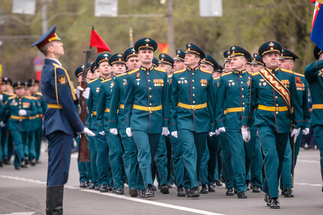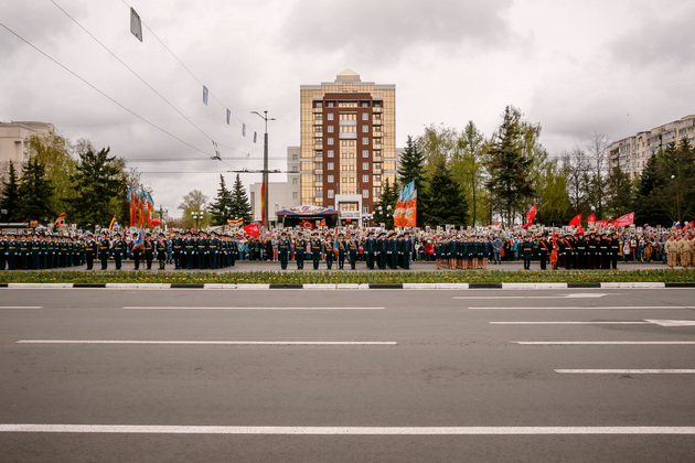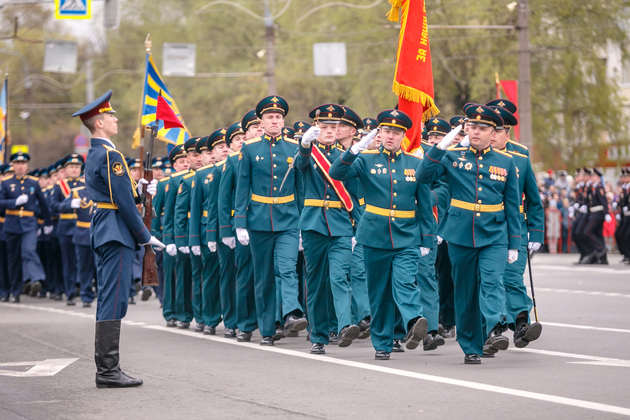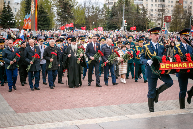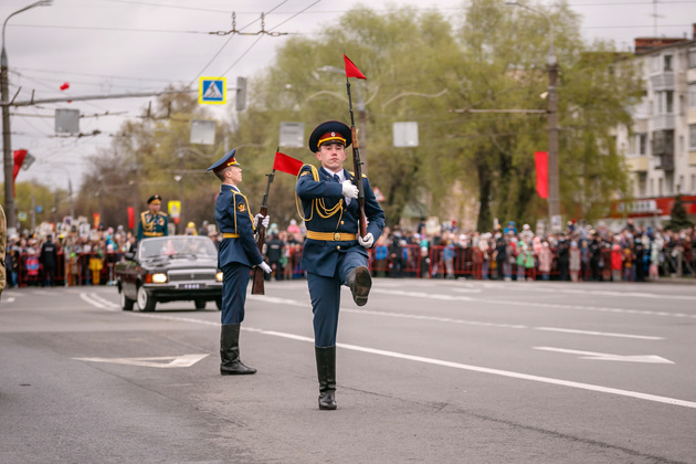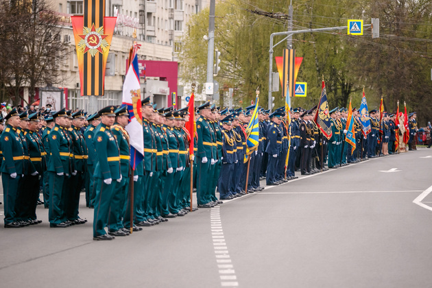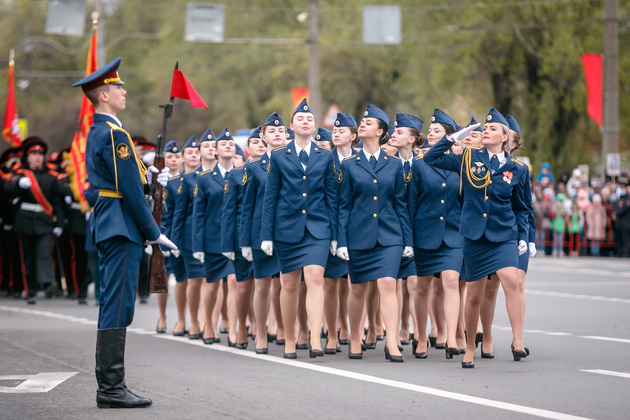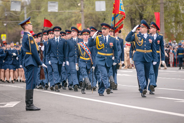 Уже на Площади Победы глава региона поприветствовал жителей областной столицы во время торжественного митинга и встретил праздничный военный парад. В нём приняли участие служащие Ракетных войск стратегического назначения, военные лётчики авиационной эскадрильи 33 отдельного смешанного транспортного авиационного полка, а также личный состав офицеров центра подготовки специалистов расчётов радио-технических войск военно-космической академии имени Г.К. Жукова.