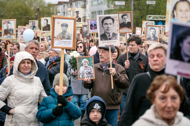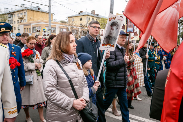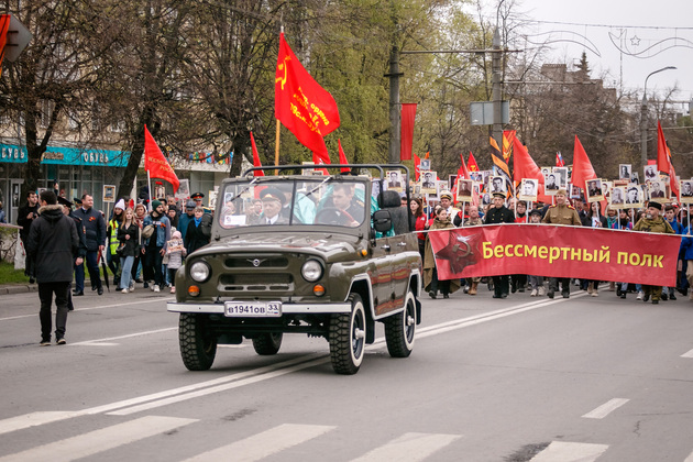 По традиции праздник начался с шествия “Бессмертного полка”. По данным Владимирской горадминистрации, в этом году в его рядках прошло более 20 тысяч человек. Возглавлял колонну автомобиль с ветеранами Владимиром Васильевичем Коробчевским, Борисом Николаевичем Павловым и Михаилом Петровичем Волосниковым. Прямо за ними следовали волонтёры с портерами 24 владимирцев - Героев Советского Союза.