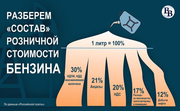 Эксперты выделяют два рычага для снижения цен на горючее – повышение минимального порога продаж топлива на бирже и снижение акцизов, которые входят в компоненты розничной цены одного литра бензина (подробно про стоимость бензина в розницу – в инфографике «ВВ»).