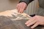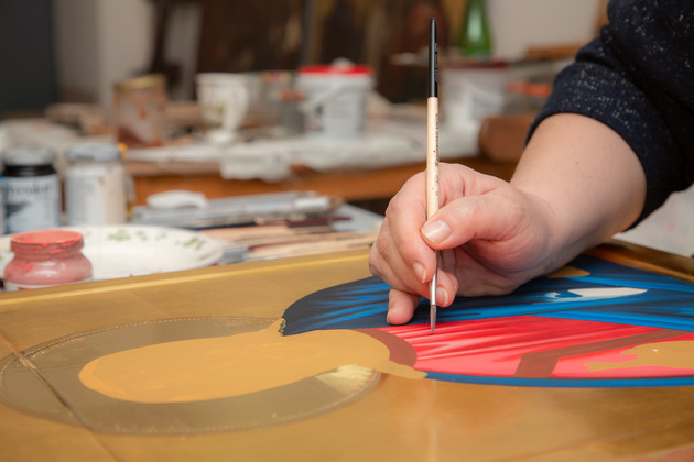 Иконописцы рублевской школы использовали для работы водку или белое вино, яйца и натертые натуральные краски. Эту технологию продолжают и художники-реставраторы Измаиловы. А вот переливы на иконе яркой позолотой оттого, что используется настоящее золото из Италии. Матушка Наталья показывает, как она берет его кисточкой с золотой картонки. И вот уже сверкает нимб!