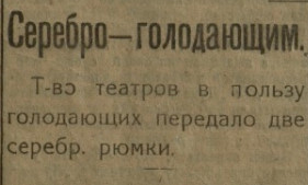 Драгметаллы для голодающих, собирали и гражданские организации. Например, муромская газета «Луч» от 10 мая 1922 года извещала: «Серебро — голодающим. Товарищество театров в пользу голодающих передало две серебряные рюмки».