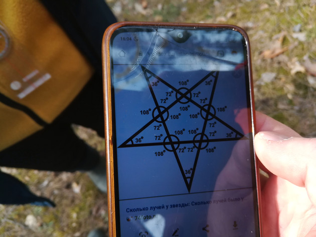 Про звезды я не пошутила: ребятам действительно предстояло рисовать звезду треком на навигаторе. С одной из групп - в составе Анны Калачевой и Антона Захарова (позывной Морпех) - в лес отправилась и я. Как только дошли до места, Морпех, у которого, на мой взгляд, чутье на правильное направление, фактически стал нашим инженером звезды, сразу объявив, что «способов у нас два»: либо, рассчитав точки схождения лучей, ставить там поэтапно одного участника и чесать с навигатором прямо на него, либо рассчитать углы каждой вершины звезды, расстояние между ними и точные азимуты для каждого луча. Выбрав второй вариант, Антон достал блокнот и, усевшись на пенек, занялся расчетами углов, длины и азимутов, наговаривая себе под нос: «250 умножить на... Здесь 81 метр у нас получается. Основание. Между лучиками - 162. А 250 - высота всей звезды. И здесь у нас азимут 18. А здесь - 72... Плюс 90, сколько получается? 162. Туда 18-м азимутом. Туда - 162-м. Сюда мы идем азимутом… О, стоямба! 18 плюс 36 и плюс досюда три по 90... 270! 324-м азимутом здесь мы идем... А теперь сюда четко на восток. Ой, екарный бабай, нам надо найти всего пять азимутов... И точное расстояние высчитать».