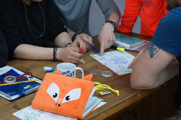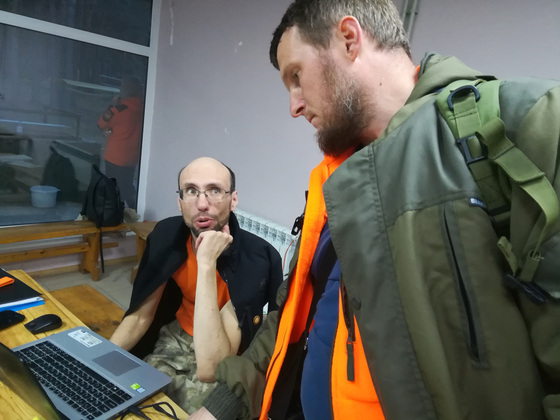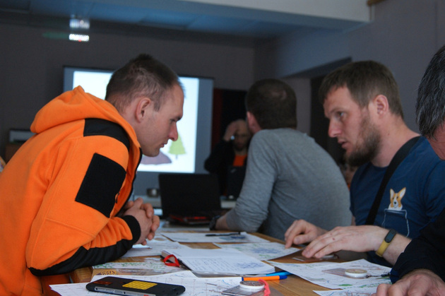 В одной из комнат нахожу Юрия Шалаева (позывной Скрудж) - это оперативный картограф владимирского подразделения «ЛизаАлерт». Именно он заливает для лис карты в навигаторы на выездах, сбрасывает треки на форум отряда и т.д. Это человек с удивительным терпением, у которого ни один мускул на лице не дрогнет и тон не изменится, даже если он объясняет одному и тому же человеку одно и то же в 55-й раз. На курсе он преподает навигацию и картографию, то есть то, без освоения чего ни один доброволец не сможет стать настоящим поисковиком. Я его застала за разработкой и накладыванием на карту заданий лисам на очередную практику. В тот день это было «рисование пятиконечных звезд» в лесу и ориентирование на местности с целью дойти до конкретной точки только по карте и компасу, сумев не заступить на красные зоны, разбросанные по всему маршруту. Контроль чистоты выполнения задачи за закрепленными за каждым курсантом статистами (чтобы по пути они никаких гугл-карт в телефоне не использовали) и навигаторами в рюкзаках, упакованными и опечатанными еще в штабе, при Софье.