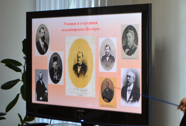 Он продемонстрировал увесистую метрическую книгу с записью о крещении Константина Тихонравова в 1822 году, сведения о его учебе в духовном училище и семинарии, формулярный список о службе Тихомирова регистратором канцелярии владимирского губернатора в 1847 году, отчеты о командировках, письма и многие другие документы.