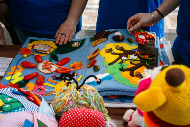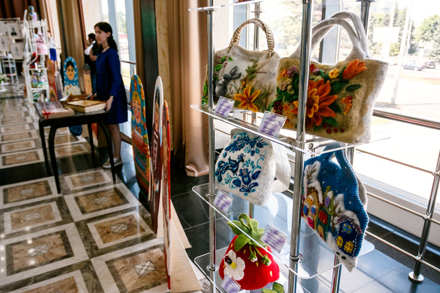 На втором этаже областной филармонии под звуки камерного оркестра развернулась выставка творческих работ сотрудников и клиентов учреждений соцзащиты, которую представляла директор департамента Любовь Кукушкина. Александровский комплексный центр социального обслуживания удивил созданием модной коллекции шикарных платьев, оформив модели в виде собрания картин. Владимирский социально-реабилитационный центр для несовершеннолетних поразил огромной коллекцией матрешек и сказочных персонажей. Арбузовский интернат им. А.Лосева выставил эксклюзивные сумки из валяной шерсти и прелестные соломенные шляпки. Гороховецкий центр «Семья» представил красочное дидактическое игровое пособие для развития мелкой моторики у детей – большую книгу с секретами и волшебством…
