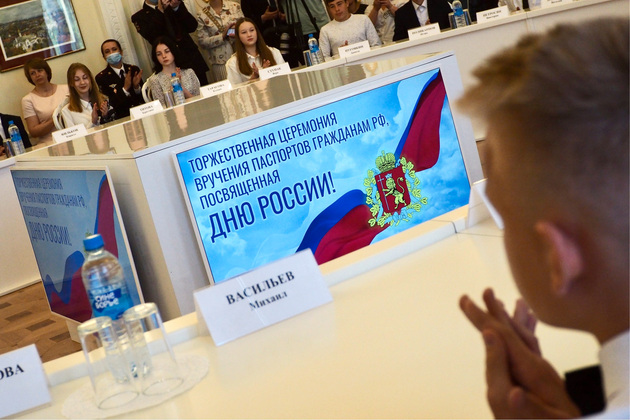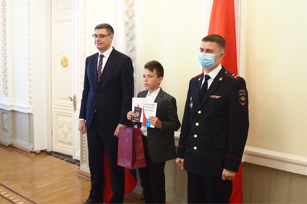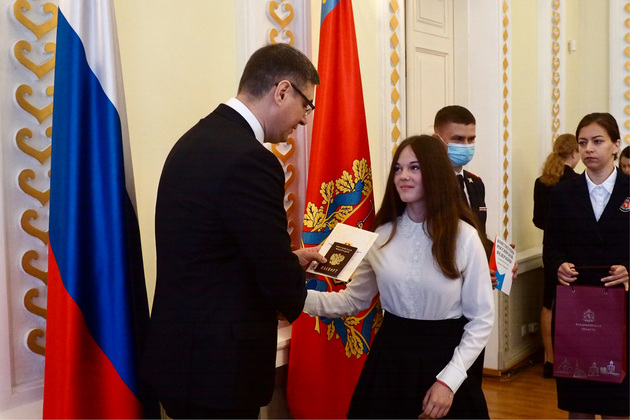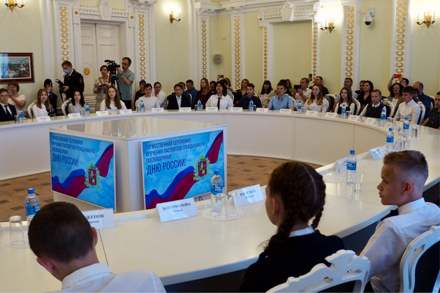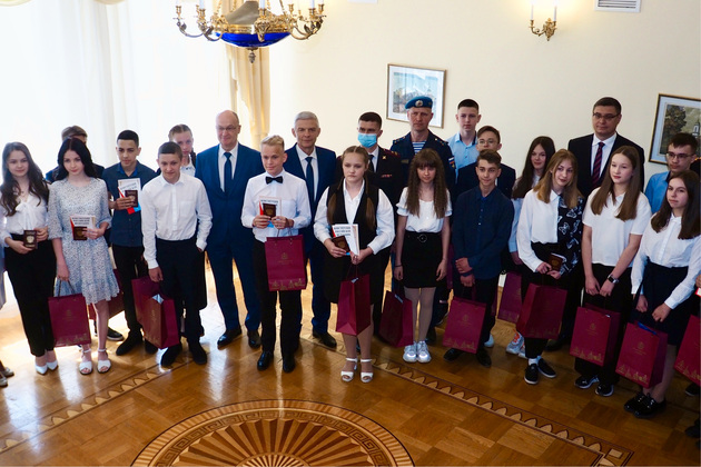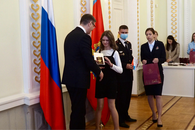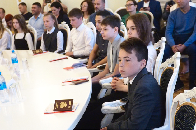Ребята внимательно выслушали все наставления и пожелания, а затем прошла торжественная церемония вручения паспортов. В зале оказались юные жители из разных городов и районов Владимирской области. И у всех уже немало достижений! Михаил Васильев из Кольчугинской школы №1 – отличник учебы, староста класса, участник хора мальчишек. Ксения Горбунова из Санниковской основной школы Ковровского района – краевед, полуфиналист всероссийского литературного конкурса «Герои Великой Победы». Данила Ермилов из Гороховецкой школы №3 – призер и победитель многих предметных олимпиад, в этом году занял 1 место в школе на олимпиаде по истории. София Жарова из Владимира – участница хора капеллы Центра классической музыки, занимается в музыкально-просветительском театре «Юла», лауреат всероссийских и международных конкурсов вокалистов. Ученик Новосельской школы Суздальского района Дмитрий Юрманов – отличник, увлечен компьютерными технологиями, занимается спортом и намерен стать военным инженером. Софья Фирсова из Собинской школы №4 углубленно изучает английский и китайский языки, в прошлом году победила на всероссийском конкурсе «Лучшие танцоры года» во Владимире.