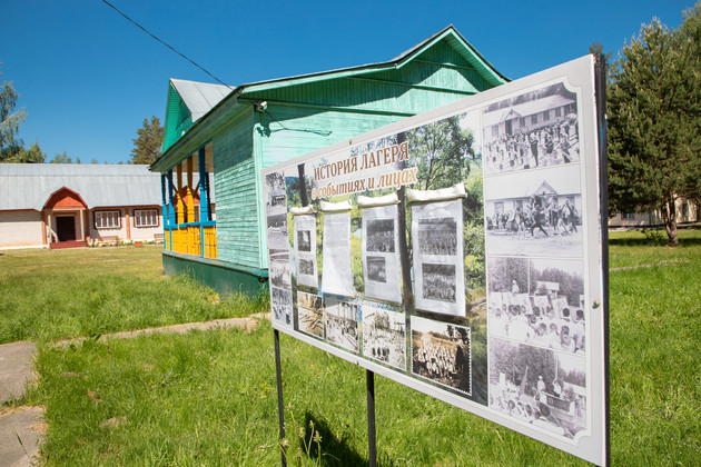 На стенде — вся история лагеря, начиная с открытия в 1952 году. Кстати, лагерь расположен в 4 км от старинного русского села Сима, подаренного Петром Первым Князю Голицыну за победу над шведами.