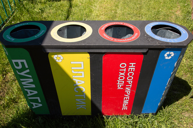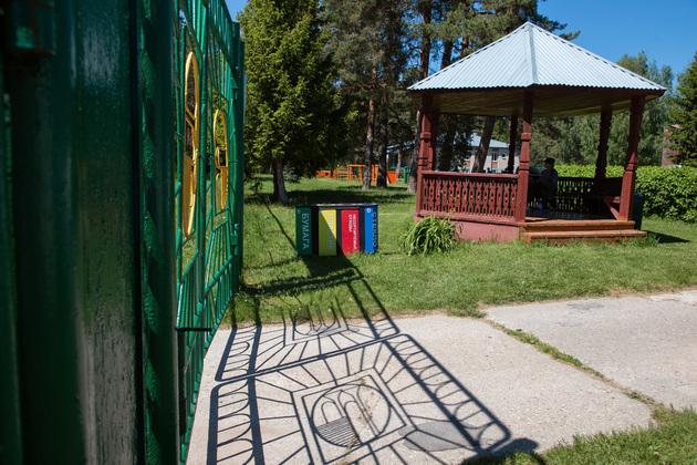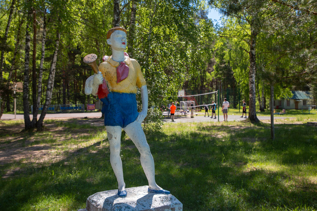 Всего в сезоне три смены (каждая 21 день), и все они посвящены определенной тематике. Первая – военно-патриотическая «Юнармия», вторая – многопрофильная, третья – спортивная. На экскурсии по окрестностям сразу отмечаем любопытный симбиоз советского наследия и современных трендов. Как, например, две статуи пионеров и контейнеры для раздельного сбора мусора.