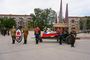 Согласно военным традициям, гроб с останками героя установили на лафете пушки под флагами Российской Федерации и Военно-воздушных сил.