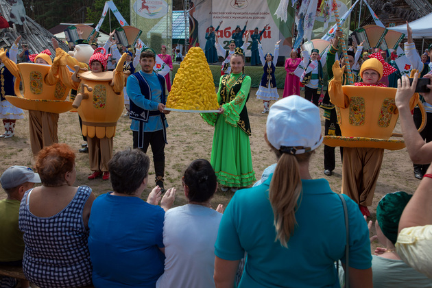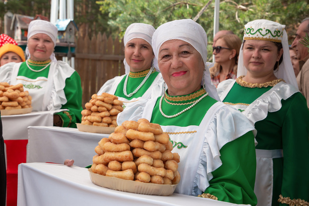 Масштабный праздник прошел на территории парка Загородный. Где еще уместилось бы столько гостей? В программе - парад национальных костюмов, вкуснейшие национальные угощения, которые татарские женщины выпекали прямо на празднике, а также различные национальные состязания.