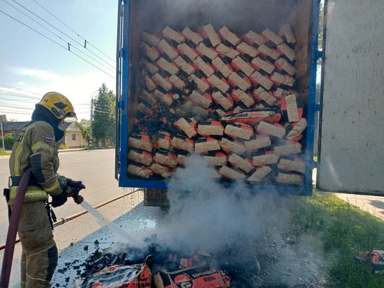 На улице Шмидта, у дома № 48 грузовой “Мерседес" замер из-за задымления в кузове. Как выяснилось, внутри кузова загорелись мешки с березовым углем. Большегруз был забит им под завязку.