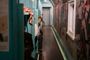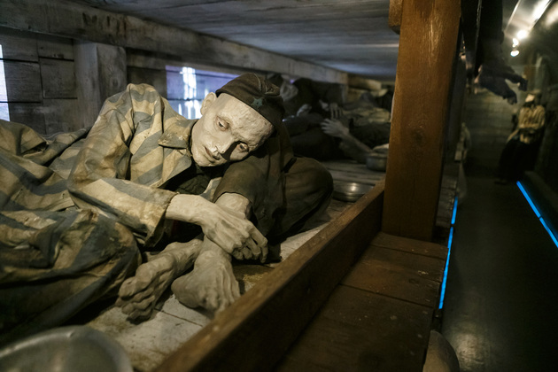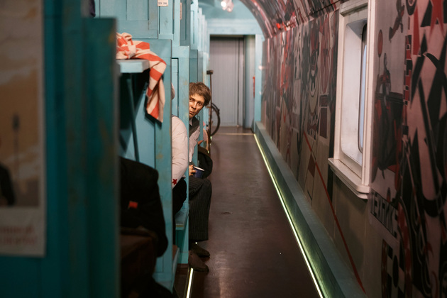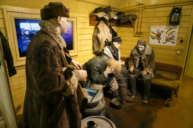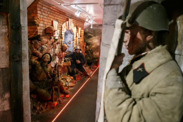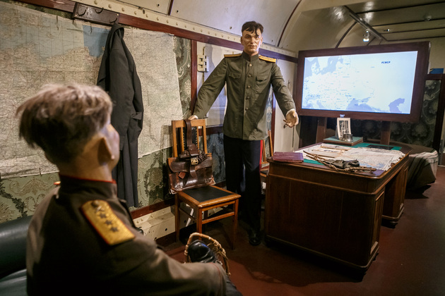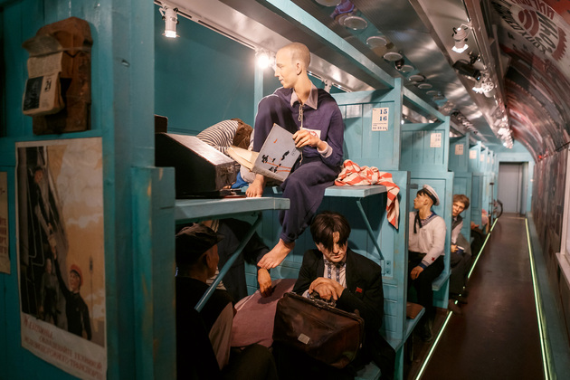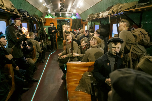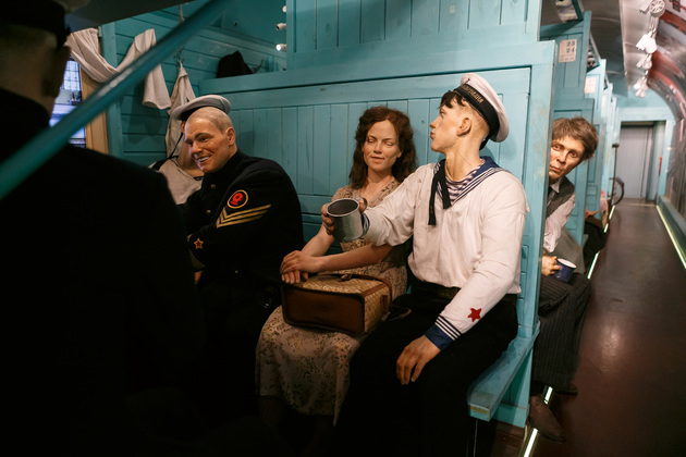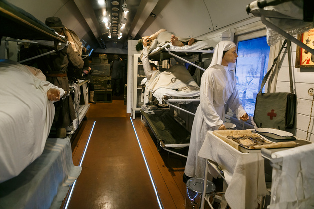 Начинается путешествие по поезду Победы с первого вагона, где обычно располагаются машинисты. Когда попадаешь внутрь с солнечного перрона, становится немного жутковато. Во-первых, приглушенное освещение, воссоздана атмосфера военного времени с танками и самолетами, во-вторых, пассажиры поезда - как живые. Они смотрят, разговаривают, перевязывают раны, перебирают оружие, рассказывают истории…
